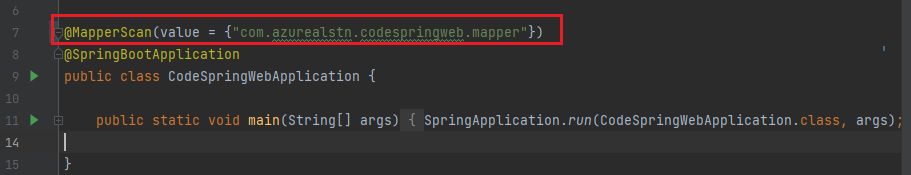 스프링 부트 메인 애플리케이션 클래스 @MapperScan을 붙이고 mapper 패키지 경로를 입력합니다.